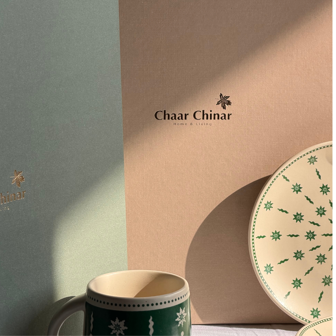 These mugs and snack plates for four are perfect for everyday coffee or chai breaks.