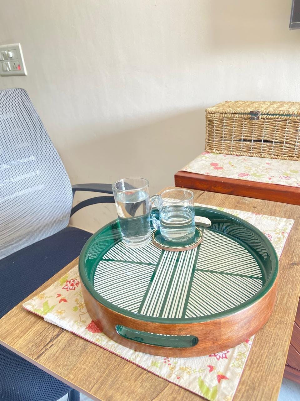 Classic striped enamel printed tray would be a masterpiece in your kitchen wardrobe. This sturdy large tray is made from solid mango wood, can be used for serving or center table tray . Also pairs well with Tarangan Dinnerware.